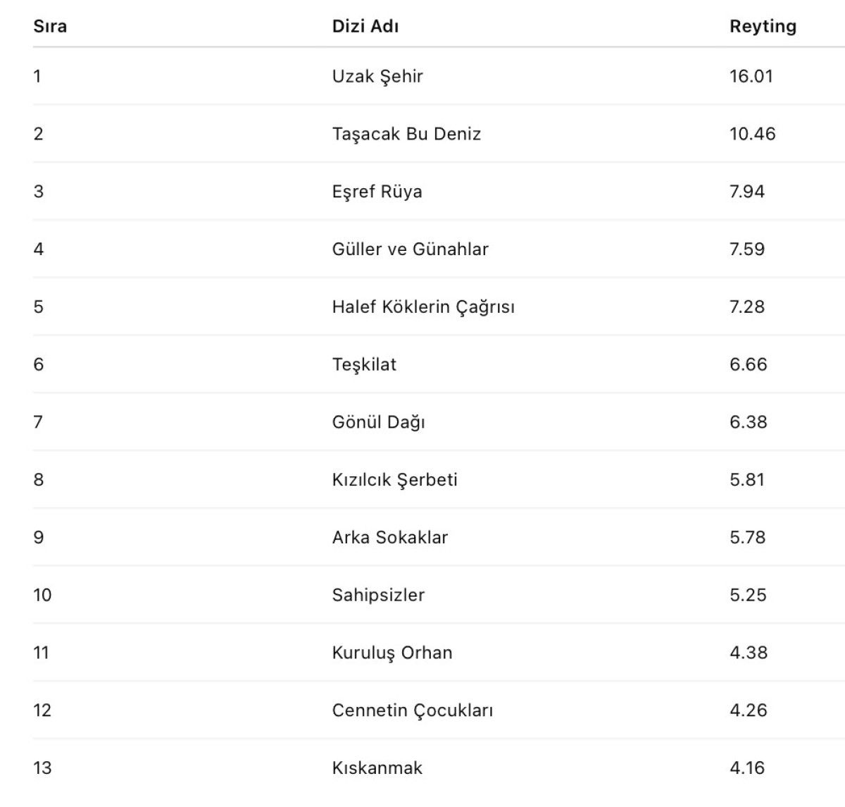 TRT 1’in yeni dizisi Taşacak Bu Deniz ise ikinci sırayı kaptı. Üçüncü sırada Eşref Rüya yer aldı.